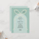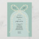 My daisy bow baby shower invitation features an arch background in two shades of teal with a large bow adorned with hand drawn daisies.