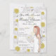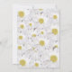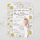 A bridal shower invitation featuring a background photo of daisies on front and back. Front features illustration of a bride with fair skin and red hair holding a bouquet of daisies which matches the background. Personalise the pink text with details of your occasion.