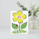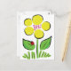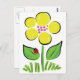 A stylised daisy in full bloom, rises above a few blades of grass. A red ladybug sits on one of the flower's leaves.