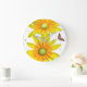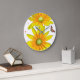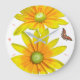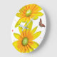Huge yellow and orange daisy flowers and a lone red butterfly make time telling a pleasure.