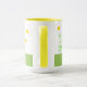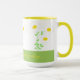 Designer yellow coffee mug, accented with greens, with a fresh white daisy print. The text can be personalised to your own inspirational message, or text is removable. Beautiful personalised custom gift idea.