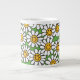 A cute hippie style pattern of white and yellow daisy flowers with faces on a green background.
