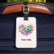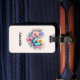 A luggage tag with a beautiful illustration. A heart-shaped bouquet of flowers in pastel blue, green, purple and yellow. With a lovely blue butterfly hovering in front.