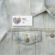 A name tag with a beautiful illustration. A heart-shaped bouquet of flowers in pastel blue, green, purple and yellow. With a lovely blue butterfly hovering in front.