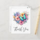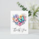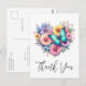 Thank you postcard with a beautiful illustration. A heart-shaped bouquet of flowers in pastel blue, green, purple and yellow. With a lovely blue butterfly hovering in front.