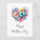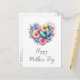 Mother's Day postcard with a beautiful illustration. A heart-shaped bouquet of flowers in pastel blue, green, purple and yellow. With a lovely blue butterfly hovering in front.