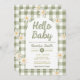 Welcome your little one with this charming Hello Baby shower invitation. Designed with a soft sage green gingham background, sweet white daisies, and a modern arch layout, this invitation is perfect for a neutral, garden, or spring baby shower.