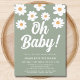 This floral baby shower invitation is decorated with hand-drawn daisies and stylish white retro typography on a green background.
