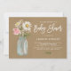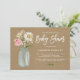 Mason jar theme baby shower invitation. Invite family and friends with this rustic floral baby shower invitation. It features white daisies, pink rose and baby's breath in a mason jar with faux kraft paper background. Personalise by adding names, date, time, venue and other details. This floral invitation is perfect for fall baby showers.
