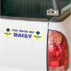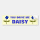 This brilliant bumper sticker features two digital images of a daisy with a green stem with two green leaves on it and light and dark blue coloured petals with a light blue centre. The background is sunshine yellow and the bright blue text reads, you drive me daisy..