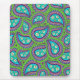 A mouse pad with a green and purple paisley design. The paisley has daisies in the middle against a light blue background.