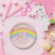 These cute birthday paper plates feature hand drawn daisies and a rainbow in pastel colours.