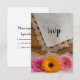 Customise the informal and elegant Daisy Trio and Lace Country Barn Wedding RSVP Card with your specific barn party marriage ceremony reply date. These pretty custom rustic ranch r.s.v.p. response cards feature a quaint floral photograph of two pink daisies and one orange flower blossom, vintage lace trimmed off white cream coloured linen handkerchief and a white bridal veil with a weathered brown barn wood background.