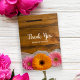 Send a warm message of gratefulness and gratitude after an engagement party, bridal shower or wedding with the country chic Daisy Trio Country Barn Wedding Flat Thank You Note. These informal yet elegant custom farm or ranch style theme thank you notes feature a quaint floral photograph of two pink gerber daisies and one orange daisy flower blossom with a white bridal veil and a weathered brown barn wood background.