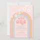 Retro inspired wild one first birthday invitation with hippie style rainbow, daisies and boho fonts and colours.