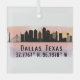 Glass ornament features Dallas Texas city skyline silhouette with watercolor splash and latitude & longitude map coordinates