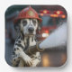 A dalmatian dog confidently holds a water-spraying fire hose, standing in front of a red fire truck.