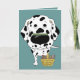 Easter Bone Hunt, Anyone? Funny Big Nose Dalmatian with a treat balanced on his nose and a basket full of bones beside him on a greeting card, ready to go Easter bone hunting.