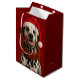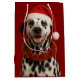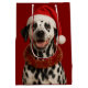 Individually designed Christmas gift bag featuring a very jaunty and happy looking Dalmatian who is sporting a very fetching santa hat and some tinsel around its neck.