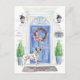 Announce your new address with our stylish announcement featuring a Dalmatian, blue front door, welcome mat, slate sign, topiaries and a floral wreath set on a grey brick background.