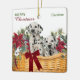 Here's a pretty Holiday ornament that would make a great gift for a grandchild, son, daughter, or anyone. Both sides of the ornament have an image of a basket of red poinsettia blossoms, white flowers, and pine bough sprigs. In the middle sit two adorable Dalmatian puppies. The wicker basket is decorated with a red bow. The front has green and red text that says "Merry Christmas, and a name. The back has your signature and the year.
