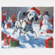 A spotted Dalmatian runs playfully through the snowy winter scene, wearing a festive red Christmas hat. This lively design highlights the breed’s distinctive coat, energetic personality, and cheerful spirit while capturing the warmth and joy of the holiday season. A heartwarming winter moment full of festive charm.