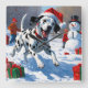 A spotted Dalmatian runs playfully through the snowy winter scene, wearing a festive red Christmas hat. This lively design highlights the breed’s distinctive coat, energetic personality, and cheerful spirit while capturing the warmth and joy of the holiday season. A heartwarming winter moment full of festive charm.