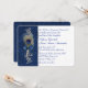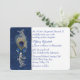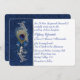 Chic peacock themed wedding invitation, with lovely graphics of a silver tone flourish, on the left side, with a colourful eye of a peacock feather and three little pearls and blue bow, against a blue on blue damask. Text in blue, against a white background on the right side of the card, is ready to personalise for your wedding day. Matching products available.