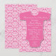 Fun, bright pink baby shower invitation with a cute and damask print background. Invite your guests to your baby shower or other event with style!