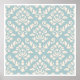 Decorative art poster of an ornate baroque style damask pattern of cream detail on a blue background and a white surround border.