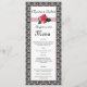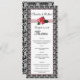 Wedding Menu Invitation borded with black and white damask pattern and decorated with printed images of red rose and ribbon. You can use it for any occasion - wedding, engagement, bridal shower, rehearsal dinner, party, celebration., business meeting. Just adjust text according to your requirements.