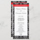 Damask wedding programs with red accent stripe and formal black and white damask pattern.