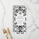 This dinner party menu design features a chandelier silhouette, bats, a spider and a black cat on a black and white damask background. You can personalise with all your menu details.
