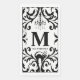 This guest towel design features a chandelier silhouette, bats, a spider and a black cat on a black and white damask background. You can personalise with your initial and your last name.