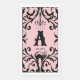 This guest towel design features a chandelier silhouette, bats, a spider and a black cat on a black and pink damask background. You can personalise with your initial and your last name.