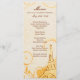 Swirls billow and curl about a burnt sienna hand-drawn Eiffel Tower against lavish, floral yellow and orange damask, accented with faint touches of a stylised dandelion pattern. A French love poem is faintly inscribed in the cream background, providing the perfect accompaniment to the customisable menu in script and engraving style fonts, also in burnt sienna.