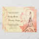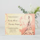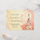 Swirls billow and curl about a chocolate brown hand-drawn Eiffel Tower against lavish, floral pale pink and cream damask. A French love poem is faintly inscribed in the cream background, providing the perfect accompaniment to the customisable wedding invitation wording in script and engraving style fonts, also in chocolate brown.