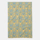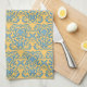 This kitchen towel has a damask element / motif, created by Kristie Hubler, repeated, in a robins egg blue / ocean blue / aqua blue colour, with a light yellow pumpkin / Italian / Mediterranean gold coloured background. Old worldly, again, Mediterranean looking.