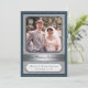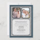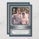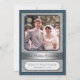 Celebrate that special couple with this Silver Anniversary party invitation. Their photo sits against a silver damask patterned background with a deep blue border. (Make sure to substitute a large, high resolution photo for this front image). Their names and wedding date (or any other text) are highlighted in the plaque underneath. Then showcase them as they were then and are now on the back with all the event information below. Matching favours and postage available.