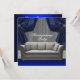 Grey damask sofa and royal blue drapes blue and grey sofa housewarming party invitation.