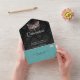 Pretty Quinceañera birthday party all in one invitation, done in a black on black damask pattern, on the inside, with a pretty pastel dragonfly, at the top. The outside is done in a aqua damask pattern. Personalise the custom text for your favourite girl's special day.