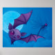 Cartoon illustration of a cute little bat chasing a damselfly under a full moon.