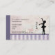 Business card template with a silhouette of a ballerina on a pretty background. This elegant ballet dancer is standing on her toes, en pointe with her arms outstretched gracefully. The word "DANCE" written beside this elegant dancer. The background is composed of a shabby vintage looking pattern with flower blossoms. The bottom portion of the design has vintage style lavender stripes alternating in dark and light colours.