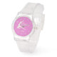 I only have one complaint. I ordered the watch with clear case and strap, and what was sent was white case and strap. I'm going to keep it because 1) it looks very nice in white, and 2) it would take too long to get a replacement made and sent in time for my occasion. Aside from the mix up with the color, the watch does look very good in white. The purple dial is actually sparkly which did not show in the online images. That was a nice surprise. If you like Swatch watches this is very similar to those. It's 33.6mm in diameter, 10.5mm thick, and 40.6mm lug to lug. Stainless steel case back says 3ATM/30m WR, so no swimming or showering or submerging this one. If you like Woodstock, this is a great choice.
