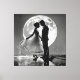 Celebrate love, passion, and timeless romance with this enchanting black-and-white illustration. It depicts a silhouetted couple sharing a magical dance beneath a full moon, bathed in the gentle glow of falling rain. This artwork exudes elegance and charm.