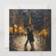 This image depicts a romantic scene straight out of a classic love story. A couple is captured in a passionate embrace, dancing on a street that appears to be shimmering with the reflected glow of golden street lights. Behind them, the iconic Eiffel Tower reaches into the night sky, adding to the unmistakable Parisian atmosphere. It's a snowy evening, and the snowflakes are gently falling around them, glowing like little stars against the dark blue of the night sky. The buildings lining the street are warmly lit, windows glowing, inviting a sense of warmth despite the cold. The painting's style is impressionistic, with thick, expressive brushstrokes that add texture and a sense of movement to the scene. It's an image that evokes feelings of love, romance, and the timeless allure of a dance shared between two people in love, making it a perfect visual for a Valentine's Day card.