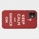 A play on the vintage British slogan. A silhouette of a dancer appears with the text "Keep Calm and Dance On" on an authentic deep red background. Perfect for a dance student or any dancer. This design is also available on a tote bag and a card.