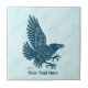 A simple, blue silhouette-like image of a lively raven (Corvus corax) done in Norse-Celtic style, superimposed on a snowy background image. Customise by adding your own text.