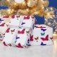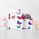Coloured dancing butterflies in red, blue, green and yellow on white wrapping gift paper.