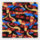 Dancing crabs on a sand and water background with black. Digital drawing.